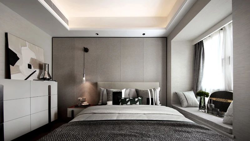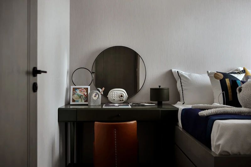 次卧从色调、床品到装饰,设计师都坚持一脉相通,与整体基调和品质一致。黑灰色系营造安静的私密空间。采用移动式落地衣柜,新颖的造型、色彩和材质赋予空间强烈的摩登现代感。灯饰也不再只是照明使用,在设计层面会将空间的氛围融合考虑。