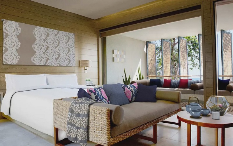 酒店拥有42间宽敞的套房、2间豪华的两居室套房和1间独栋的4居室别墅,套房有雨林房和海景房可供选择,雨林套房室内以原木色和大地色的装饰主色调,加上色彩鲜艳且宗教意味浓厚的布艺、灯饰等点缀。