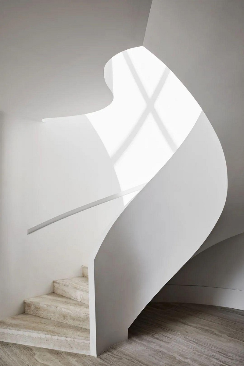 入口采用温暖而简约的现代木门,双层立面和落地玻璃设计。右边的雕塑和水景与室内的螺旋楼梯和雕塑相呼应,创造出空间的流动性。