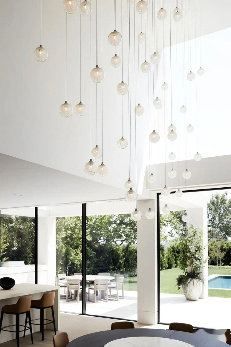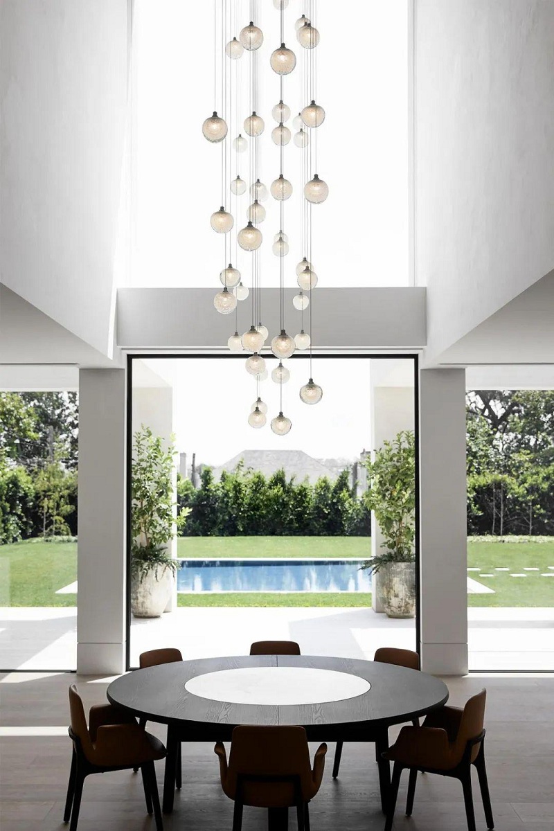 客厅,餐厅,厨房和吧台的设计采用开放式设计,各区域间的界限被模糊,创造出更多的连通和交流。圆形餐桌来自意大利家具品牌Poliform,搭配同品牌的餐椅,放置在挑空的中部位置,简约优雅,视觉上非常舒适。