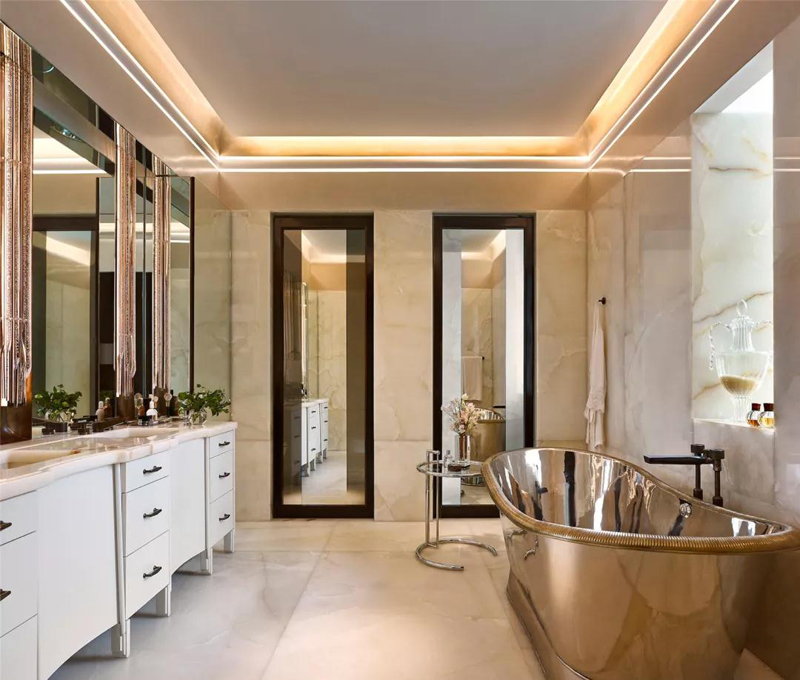 主浴室的墙壁和地板采用细白条纹的玉石板材装饰,内置William Holland 精心定制的古典抛光金属独立式浴缸,配以P.E.Guerin铸造的古铜色卫浴五金制品。