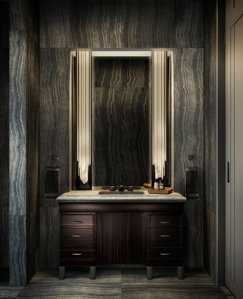 另外一间浴室的淋浴房、梳妆台以及地板均采用灰色玉石板材设计,配备了定制款黑金属色的玻璃棒式壁灯。
