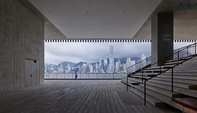 「地下大堂」是博物馆中央的集合点,也是Herzog & de Meuron为M+量身定制的空间。柱子上展出的是中国台湾资深水墨艺术家董阳孜的书法作品,整个创作以易经为灵感。将中国文化经典融入当代的建筑空间,为文字欣赏带来全新的体验。大量使用混凝土材质设计,显示出了一种最本质的美感,两边的天窗,能将自然光引入室内,缓解了混凝土空间的压抑感。