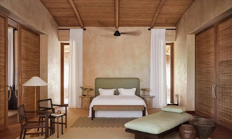 每间平房坐拥不同的酒店景观,每间平房都有自己独特的室内设计元素和个性化的配色方案,但整体都以沙土暖色调为主,为宾客营造一种生活的气息。