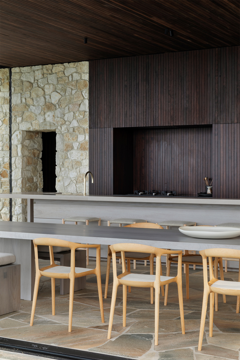 玻璃墙营造出一种坐在山脊开阔的环境中。为了中和这种通透与开敞,设计师将亭子偏移到石墙的两侧,从而分割房屋的使用,创造了深度和封闭性。
